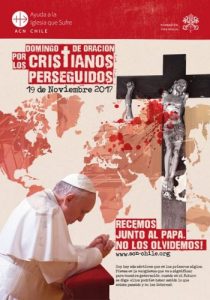 “¿Cuántos de ustedes rezan por los cristianos que son perseguidos?”, es la pregunta que nos hace el Papa Francisco. Acogiendo este llamado, Ayuda a la Iglesia que Sufre invita a todos los chilenos a rezar por ellos. Especialmente este 19 de noviembre, fecha que la Iglesia chilena ha instaurado como el “Día de oración por los cristianos perseguidos”. La esperanza de ellos está en nosotros, ¡Ellos confían en el poder de nuestra oración!