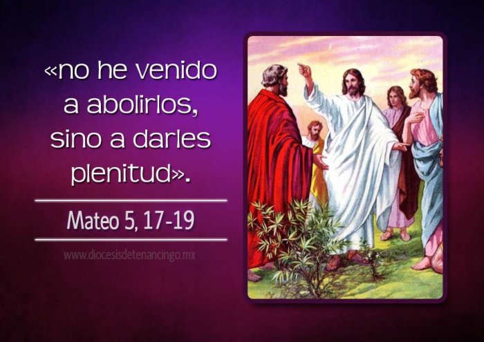 En aquel tiempo, Jesús dijo a sus discípulos: «No penséis que he venido a abolir la Ley y los Profetas. No he venido a abolir, sino a dar cumplimiento. Sí, os lo aseguro: el cielo y la tierra pasarán antes que pase una i o una tilde de la Ley sin que todo suceda. Por tanto, el que traspase uno de estos mandamientos más pequeños y así lo enseñe a los hombres, será el más pequeño en el Reino de los Cielos; en cambio, el que los observe y los enseñe, ése será grande en el Reino de los Cielos».
