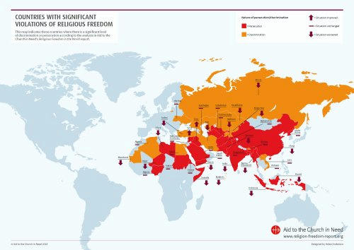 El islamismo extremista, el nacionalismo exacerbado y las ideologías autoritarias siguen siendo las principales fuerzas motrices de la persecución contra los cristianos y otras minorías religiosas. El Informe de Libertad Religiosa de ACN, cuya última edición fue presentada en noviembre de 2018, muestra la situación en 196 países. «Observamos con gran preocupación que, lamentablemente, estos tres elementos no están disminuyendo, sino todo lo contrario. Esto puede observarse actualmente en países africanos como Burkina Faso, Níger y Benín. Allí, la presión sobre las misiones católicas, a los sacerdotes y a las religiosas está aumentando dramáticamente. La gente tiene cada vez más miedo», lamenta Heine-Geldern.