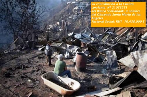 El obispo diocesano de Santa María de Los Ángeles, Felipe Bacarreza Rodríguez, ha llamado a los integrantes de las comunidades católicas de la provincia del Bio Bio a plegarse a la campaña que ha levantado la Pastoral Social “esta vez para apoyar a los hermanos y hermanas de la Diócesis de Valparaíso, que se han visto seriamente damnificados por el incendio en los cerros Rocuant y San Roque”.