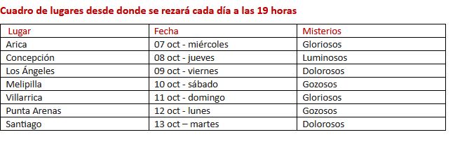 Este rosario a las 19 horas, del 7 al 13 de octubre, será rezado desde diversos lugares de Chile y emitido por el canal de Youtube y el canal de Facebook de Misión Fátima Chile. El día 13, la emisión será desde Santiago y cada misterio se rezará desde lugares emblemáticos.