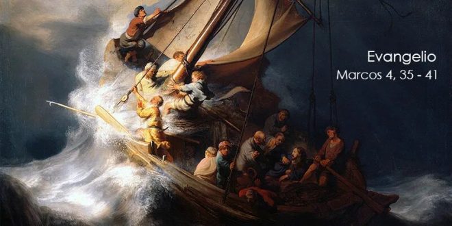 «Se levantó una gran tormenta de viento y las olas rompían contra la barca, de manera que ya se llenaba la barca». Antes de decirnos cómo reaccionan los discípulos, el evangelista nos dice la situación de Jesús: «Él estaba en popa, sobre una almohada, durmiendo». Es la expresión de la máxima serenidad. Se explica que Jesús duerma por el cansancio de todo un día de enseñanza. Los discípulos, en cambio, no obstante ser pescadores y conocedores de ese lago, están presa del miedo de perecer y no entienden la calma de Jesús: «Lo despiertan y le dicen: “Maestro, ¿no te importa que perezcamos?”». No lo despiertan porque confíen en que Él puede salvarlos del peligro, sino porque no toleran su calma. La pregunta contiene un reproche contra Jesús; le atribuyen estar indiferente por la suerte de ellos. Jesús no se ofende por ese injusto reproche ni se detiene en él, sino que pasa a la acción, que demuestra cuán errados estaban en su suposición: «Despertado, increpó al viento y dijo al mar: “Calla, enmudece”. El viento cesó y sobrevino una gran calma». Quedó en evidencia, que, estando Jesús sobre esa barca, los discípulos no debían tener miedo. Y es lo que Jesús les enseña: «¿Por qué están tan miedosos? ¿Aún no tienen fe?». Habiéndolo visto sanar enfermos y expulsar demonios, purificar leprosos y perdonar pecados, Jesús esperaba que, estando Él con ellos, no tuvieran miedo a las fuerzas naturales. Jesús demostró tener poder sobre el viento y el mar. Es un poder que sólo Dios tiene. Si antes había tenido «miedo» a las fuerzas naturales, ahora que todo está en calma, ya no tienen miedo. Pero, visto el poder de Jesús, «temieron con gran temor». Comprenden que ese poder no pertenece sino a Dios y experimentan lo que es natural en el ser humano ante la divinidad: el temor. El temor sigue a la captación de la presencia de Dios y es, por tanto, un don del Espíritu Santo. Si antes habían preguntado ante la actuación de Jesús: «¿Quién es este, que hasta los espíritus inmundos obedecen?» (cf. Mc 1,27), ahora preguntan: « ¿Quién es este, que hasta el viento y el mar obedecen?». La respuesta es clara: «Él es quien los creó».
