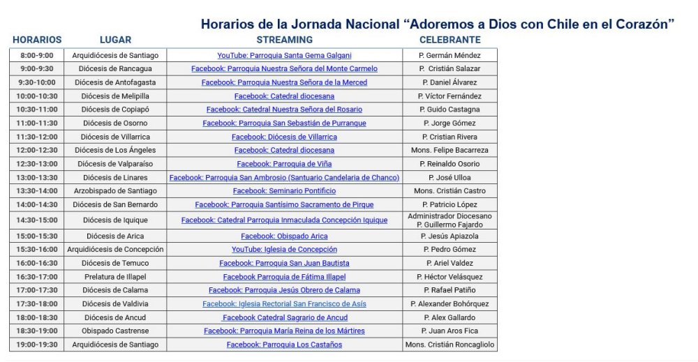 El próximo 25 de septiembre, 20 diócesis de la iglesia católica en Chile se unen para celebrar una Jornada Nacional de Adoración Eucarística, durante 11 horas continuas, que lleva por lema “Adoremos a Dios con Chile en el corazón”; y que será emitida en streaming desde las 8:30 am a las 19:30 pm por el portal en Facebook de Misión Fátima Chile (únete aquí e infórmate de los diversos lugares y horarios en el cuadro al pie de esta nota).