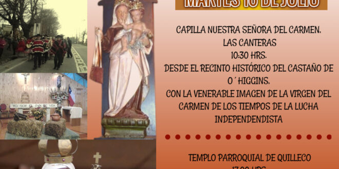 En la mañana del martes 16 de julio a partir de las 10:30 hrs. en el Recinto Histórico del Castaño, Las Canteras, se dará inicio a una procesión en honor a nuestra Patrona de Chile, posterior tendremos la solemne Eucaristía en la Capilla de Las Canteras, erigida en honor a la Virgen del Carmen, donde se sitúa la imagen que ostenta más de 200 años de vida, según consigna la historia fue regalada por el Libertador Bernardo O´Higgins a su madre Isabel Riquelme, en el pasar de los años la figura de la Virgen María sería de tal relevancia que hoy es Patrona y Reina de Chile con la advocación Del Carmen.