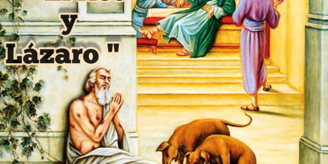 Había un hombre rico que se vestía de púrpura y lino finísimo y cada día hacía espléndidos banquetes. A su puerta, cubierto de llagas, yacía un pobre llamado Lázaro, que ansiaba saciarse con lo que caía de la mesa del rico; y hasta los perros iban a lamer sus llagas.