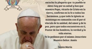 Para acompañar al Papa Francisco en su recuperación, los invitamos a rezar esta oración diariamente: Oh Dios, que para suceder al apóstol san Pedro elegiste a tu siervo Francisco como pastor de tu grey, escucha la plegaria que tu pueblo te eleva hoy por su salud y haz que nuestro Papa, vicario de Cristo en la tierra, confirme en la …