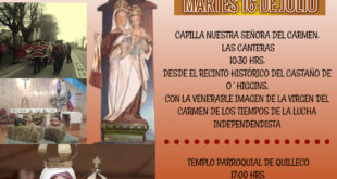 En la mañana del martes 16 de julio a partir de las 10:30 hrs. en el Recinto Histórico del Castaño, Las Canteras, se dará inicio a una procesión en honor a nuestra Patrona de Chile, posterior tendremos la solemne Eucaristía en la Capilla de Las Canteras, erigida en honor a la Virgen del Carmen, donde se sitúa la imagen que …